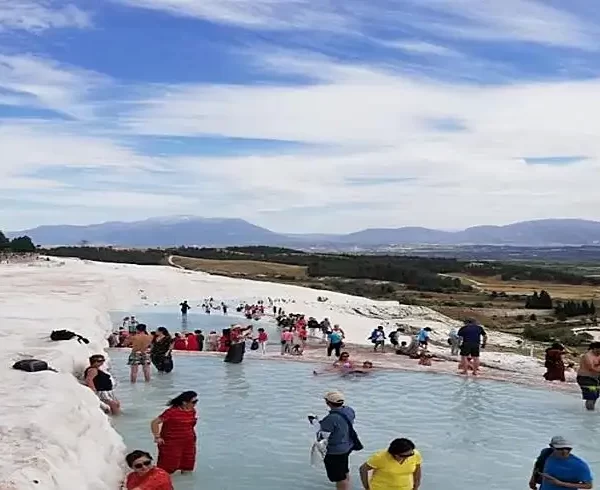 Prohlídka pak pokračuje k divům Pamukkale, které se nacházejí na úpatí ohromujících bílých teras známých jako travertiny. Tyto terasy, vytvořené po tisíciletí vodami bohatými na minerály, připomínají zamrzlé vodopády a obsahují přírodní termální bazény, o kterých se předpokládá, že mají léčivé vlastnosti.