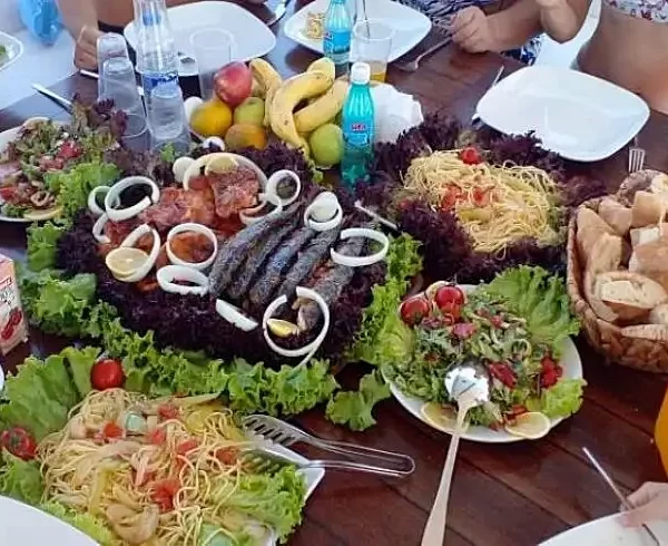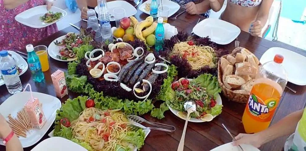 * Mittag- oder Abendessen (Grill, köstliche Salate, Reis, Spaghetti und Obst)